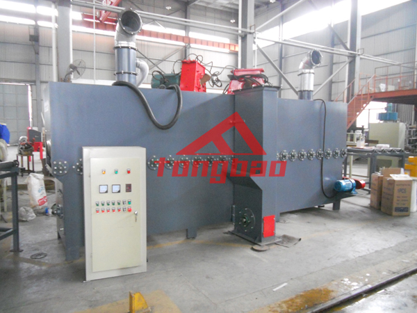 杭州某石材廠家拋丸生產(chǎn)線裝車發(fā)貨,該拋丸生產(chǎn)線采用輥道通過(guò)式輸送,內(nèi)部?jī)膳_(tái)拋丸機(jī)同時(shí)拋射,覆蓋面積大,拋射均勻,效率高。